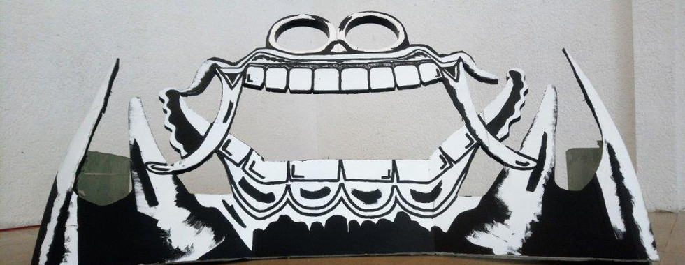 Overlaying a simplified mask-design, inspired by those found in Bali, the mask was finally carved out of the boat hull. The final painting attempts to emulate the inking styles found in comics.